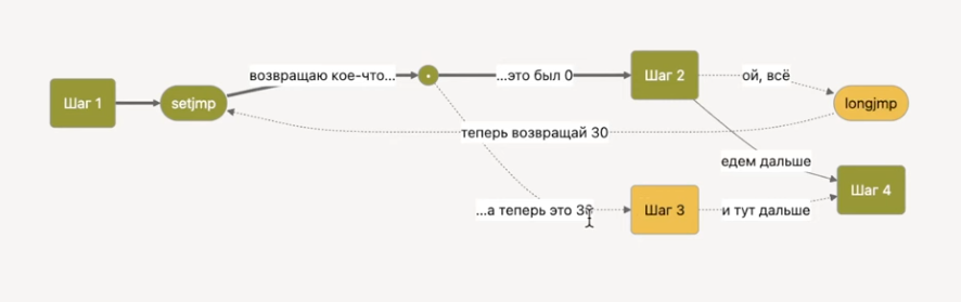 jmp_buf— тип данных, представляющий сохранённое состояние выполнения (контекст), включая регистры, указатель стека и указатель инструкции. Размер и содержимое зависят от реализации.setjmp(env)— (по простому - сохраняет точку возврата) сохраняет текущий контекст в env и возвращает 0 при прямом вызове. При последующем возвращении, инициированном longjmp, setjmp возвращает ненулевое значение, переданное в longjmp.longjmp(env, val)— (по простому - возвращаеться в точку возврата) восстанавливает контекст, ранее сохранённый в env, и заставляет ранее вызванный setjmp1) вернуться с значением val (если val == 0, оно преобразуется в 1). Выполнение продолжается как будто setjmp только что вернуло это значение.